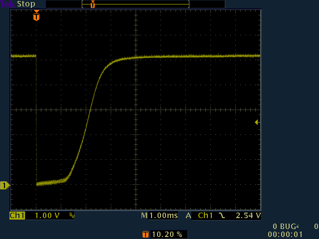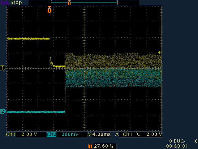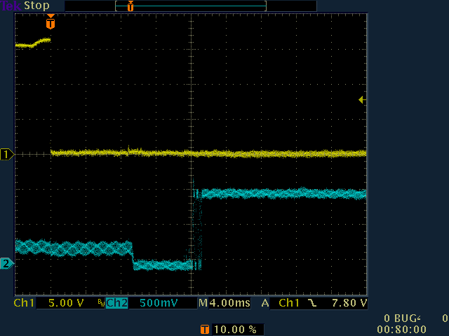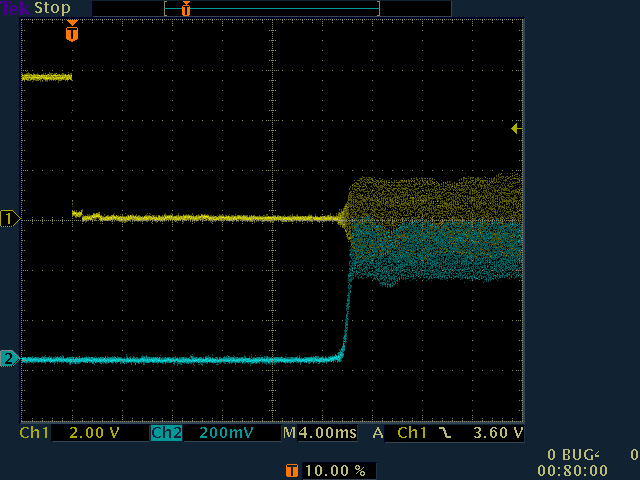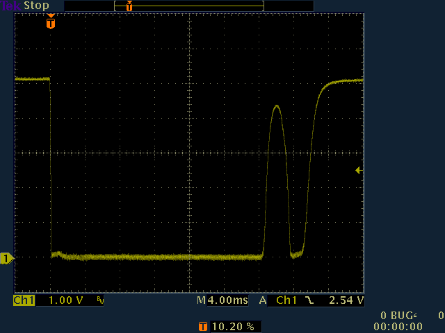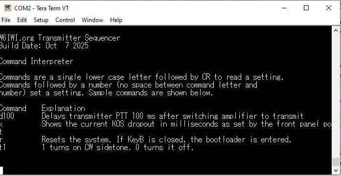The video above shows the transmitter sequencer installed and running. The sequencer is delaying the bug keying signal to the transceiver until 100 ms after the PTT has been sent to the amplifier. The amplifier PTT is dropped about 2 seconds after the last key closure (this is the KOS (Keyboard Operated Send) delay that is set on the front panel. Front panel LEDs indicate the state of each output SSR. Although not audible in the video, the sequencer includes a piezoelectric transducer on the PCB. This provides 500 Hz CW sidetone. ![]() The image above shows the PCB mounted in the case. Note that in this revision (rev B), the PCB mounting holes did not get drilled. The PCB is held in place by a drop of RTV adhesive on the center PCB mounting post in the enclosure. The front of the PCB is held in place by the bushing for the front panel pot and the LED light pipes. The round black object is a piezoelectric transducer that supplies CW sidetone at 500 Hz. It can be enabled and disabled through a jumper on J1 and also through a command on the terminal. ![]() The above image shows the front panel. The pot at the right sets the KOS dropout delay and includes the power switch. The five indicators are LEDs in series with the output SSRs. The LEDs are 0603 SMT LEDs with light pipes above them to make the LED light appear on the front panel. ![]() The image above shows the rear panel. The USB port is used for power. A terminal program (such as Tera Term, can be used to configure the system. The configuration commands are shown in a screen shot further down this page. The USB port is also used to load new firmware as shown later on this page. The left terminal block is inputs the sequencer. Everything except the KSR Sense is looking for a contact closure to ground. Each input has a 10k pullup to +5V. The KSR sense is opto isolated and is to be wired across a KSR printer (keyboard and selector magents in series). It a 1/4 inch TRS connector is used to plug equipment into the 60 mA loop, a 1/4 inch TRS Y connector such as this. When the keyboard opens, high voltage appears across the KSR sense input for 22 ms or more. This trips the Keyboard Operated Send sequence that switches the amplifier to transmit, delays, then turns on the transmitter and enables the terminal unit transmit. When the printer is receiving data, there is also high voltage across the machine. On a mark to space transition, the selector magnets generate a "flyback" voltage. On a space to mark transition, a high voltage pulse is also generated as the selector magnet current ramps up. These two voltage spikes are considerably shorter than the 22 ms bittime (60 wpm). They are about 2 ms. The software requires a pulse of at least 11 ms to trip the KOS, so KOS is activated on keyboard activity, not on received data. The video above is a quick demo of the preliminary transmitter sequencer. The video says that the transmitter and amplifier drop at the same time when the microphone PTT is released. The current firmware drops the amplifier after the transmitter (default 100 ms). The video is showing a rev A board. It DOES have the three mounting holes, but the footprint for the USB interface chip is wrong. Rev B fixed the footprint but lost the mounting holes. ![]() The image above shows the user interface through the USB interface with Tera Term. The serial port is set to 19.6 kbps, 8N1, XON/XOFF handshake, and a 1 ms character delay. In the setup terminal menu, local echo is enabled (half duplex operation(). Commands are a single letter. If followed immediately by a number (no space or tab) and terminated with a carriage return, the setting is changed to the specified value. If the letter is followed immediately by a carriage return, the current setting is shown. Any changed setting is written to EEPROM and restored on the next power cycle. The image above shows the signal at U2-5 during RTTY reception. The selector magnet flyback voltage on a mark to space transition causes a high voltage across the Teletype turning on the LED in U2, causing the phototransistor to conduct and pull its output low. Note that the line is low for about 2 ms, much shorter than a 22 ms bit time, and much shorter than the 11 ms threshold the Transmitter Sequencer uses to sense Keyboard Operated Send. The image above U2-5 on the transmission of a character by the keyboard. Note that U2-5 is low for about 24 ms (a bit longer than the 22 ms bit time) as the keyboard is open for the start bit. This is longer than the 11 ms threshold for Keyboard Operated Send, so the Transmitter Seqiemcer goes into transmit (brings up the amplifier, waits 100 ms, then brings up the transceiver and puts the terminal unit in transmit). The space to mark transition causes a sudden current change in the selector magnet again causing a flyback voltage. This is the seconds 1 ms low pulse. Each time a space bit is generated by the keyboard (keyboard open circuit), U2-5 again goes low for the bit time, resetting the Keyboard Operated Send dropout timer (front panel adjustable from 0 to 10 seconds). ![]() The Dentron Clipperton-L was in standby and driven with low power RF. The amplifier was then taken out of standby. In the image above, the yellow trace going low is the signal telling the Dentron to go out of standby (RF bypass). The blue trace is the output of an RF detector on the output of the Dentron amplifier. At the beginning of the left end of the blue trace shows the output with the amplifier bypassed. About 10 ms after the amplifier is told to go out of bypass, the bypass relay in the amplifier starts switching leaving no RF output. About 12 ms after the amplifier was told to go out of bypass, the amplifier comes online with some contact bounce for the next millisecond. The amplifier is fully online about 13 ms after the amplifier was told to go online. ![]() The image above shows the amplifier returning to standby (bypass). Once again, the yellow trace is the signal driving the by